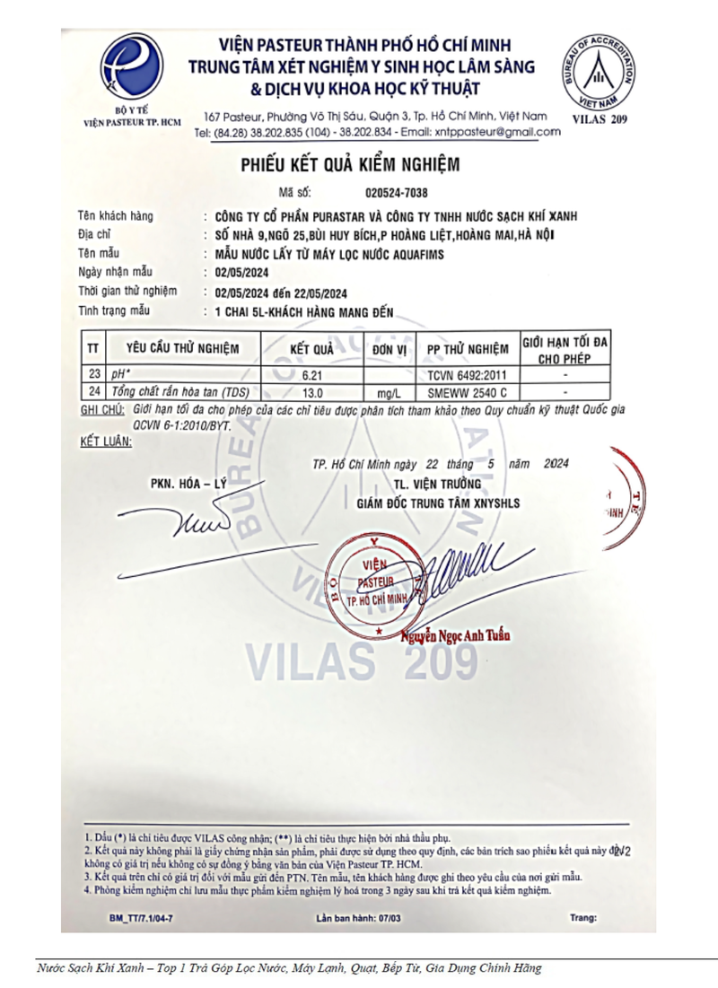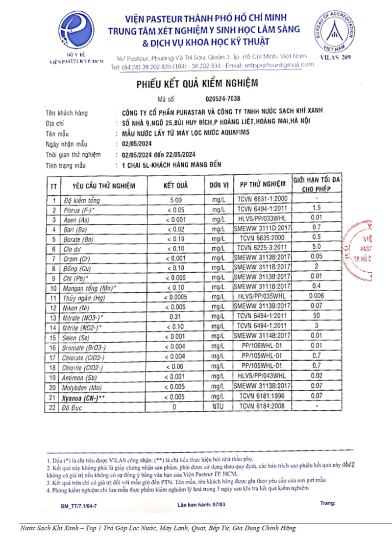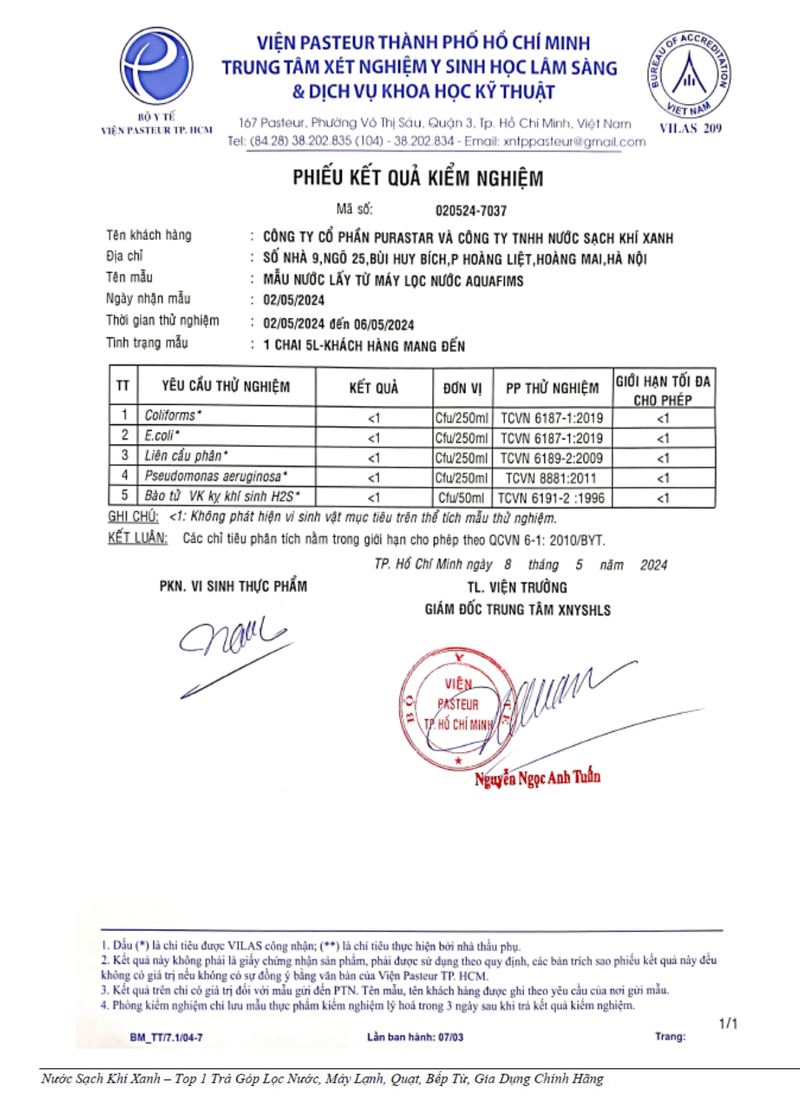 Chứng nhận viện PASTEUR -Kiểm nghiệm đạt chuẩn nước sinh hoạt