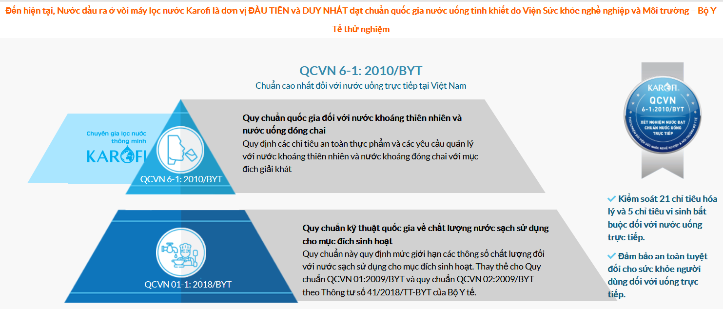 - Nước sau lọc đạt Chuẩn nước uống tinh khiết đóng chai QCVN 6-1:2010/BYT
